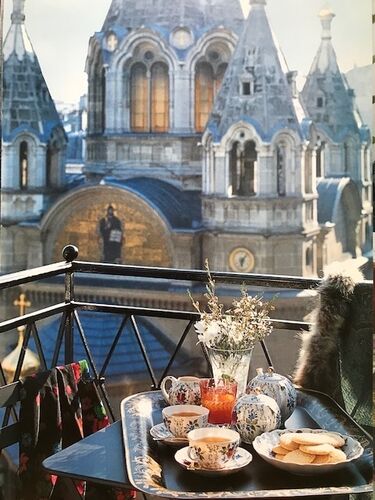 こちらは同じ雑誌に載っていたパリのアパート。壁紙の色が、欧州はおしゃれですね。椅子も凝っています。カボチャ型のティセットも何気に珍しいと思いました。こんなところで紅茶飲みながら読書できたら素敵。5階くらいでしょうか。 牛のセットは野菜を入れ…