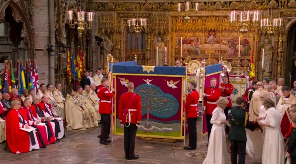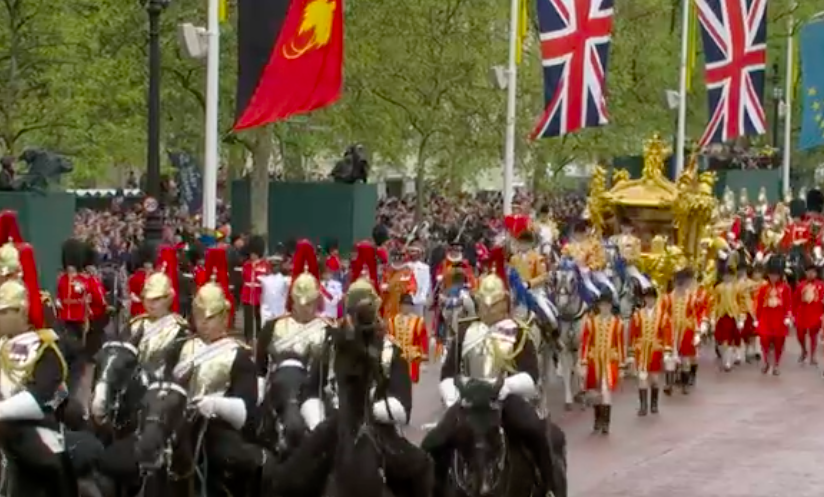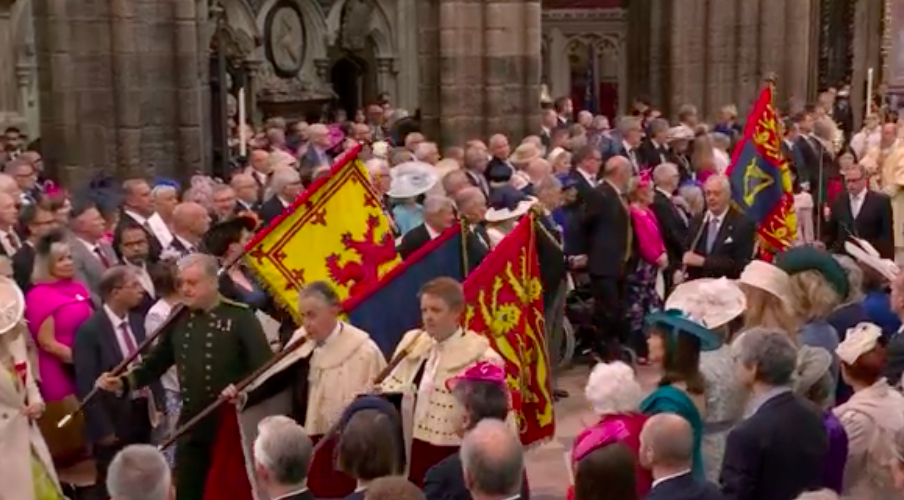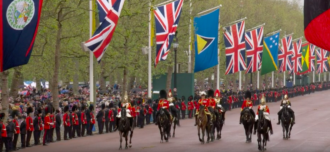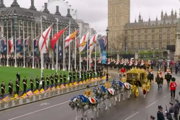 写真は時系列で、古いものが1番下になります。フィリップ殿下、エリザベス女王の葬儀の時もライブで夜中まで見入ってしまいました。今回も3時間と長丁場でしたが、結局ライブで見てしまいました。今回は、途中でもうやめようかと思ったほど自分には退屈でした。チラチラ見ながら、美容体操したり、料理したり。面白そうな場面はPCに張り付いて、スクショを撮っていました。やはりライブでないと見られない場面もあり、報道されない小さいことが、私にとってはツボだったりするので、ライブは良いです。例えば沿道の旗です。3本足の旗。あら?面白い、というポイントが時々あります。左から2つめの旗が、私が気になった3本足の旗です。