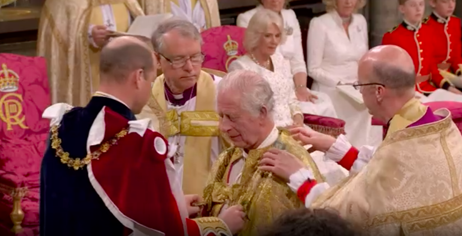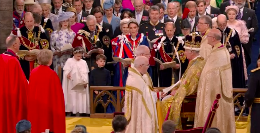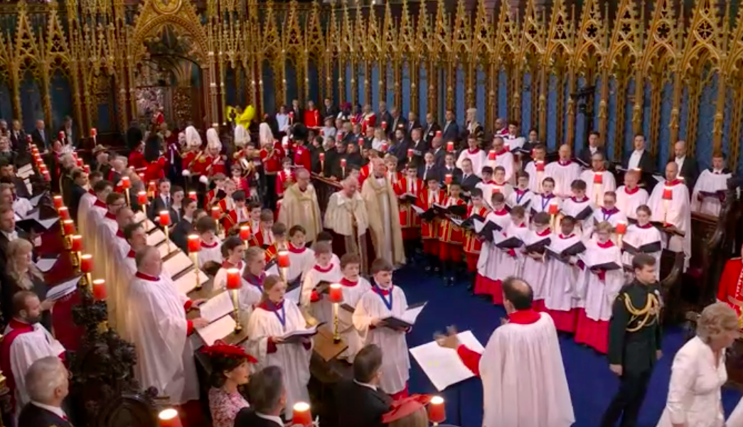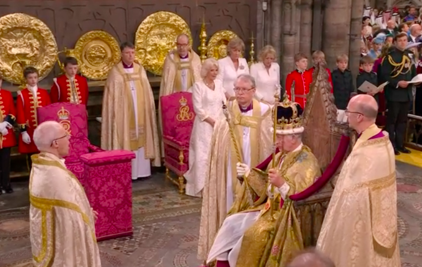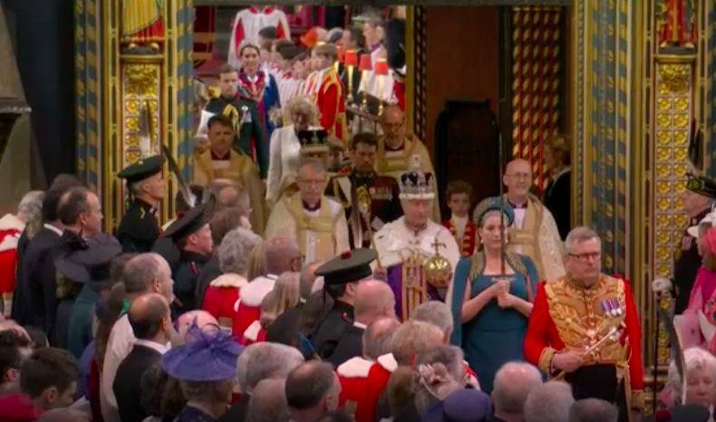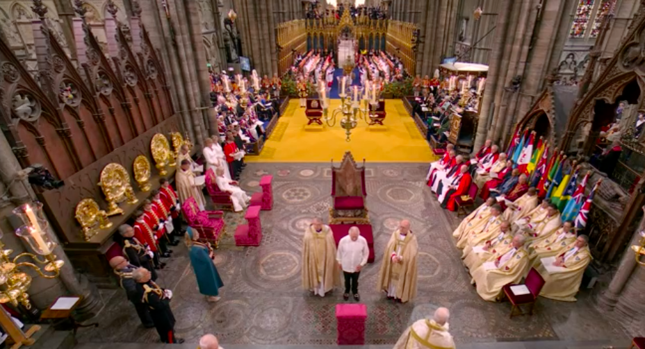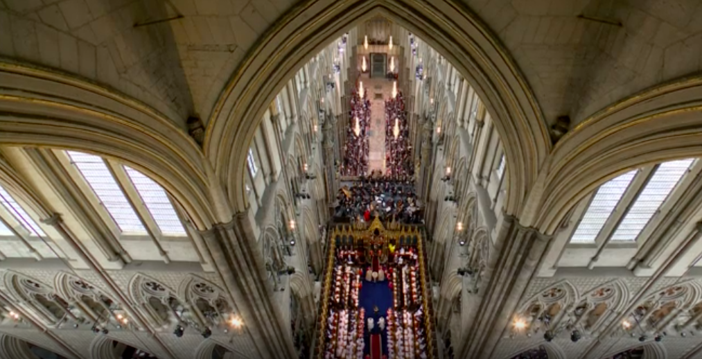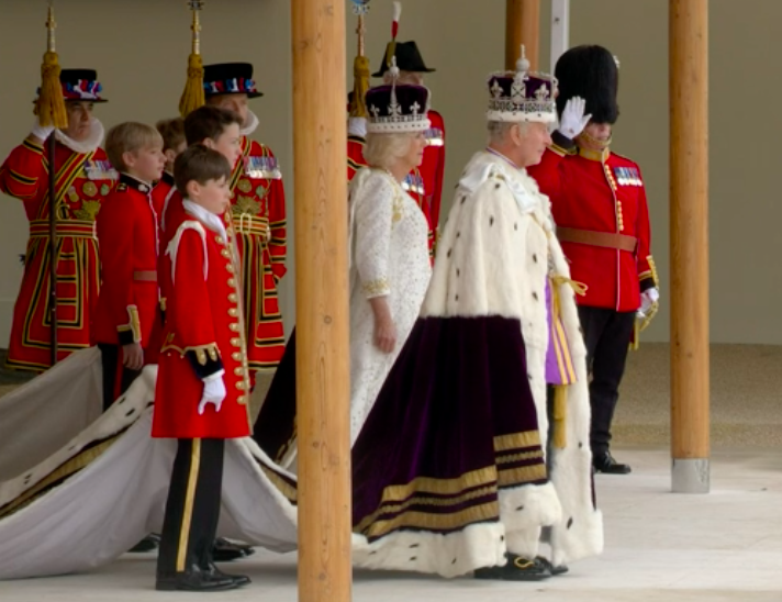 新国王が、赤い上着と白いブラウスも脱いで、何か誓ってから、今度は白いブラウスとゴールドのガウンを着せられて、イスラムっぽい歌に載せて、また何かの儀式。え?これが英国教会?と一瞬狐につままれてしまいました。エリザベス女王のとき、この場面はあったのかしら。あれこれと、誓います。I will.と宣誓しないといけないのは、圧迫感ありますね。