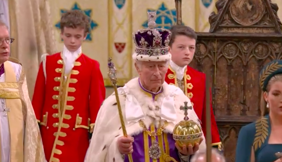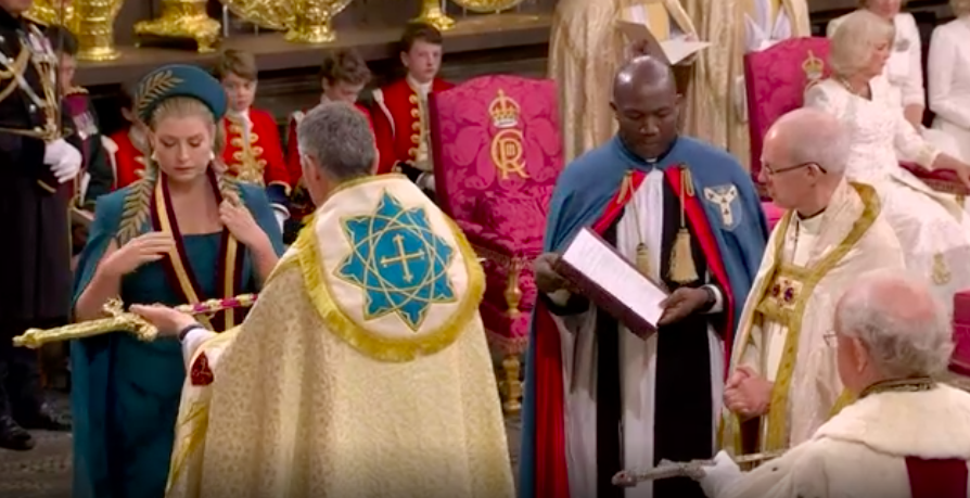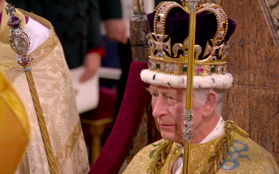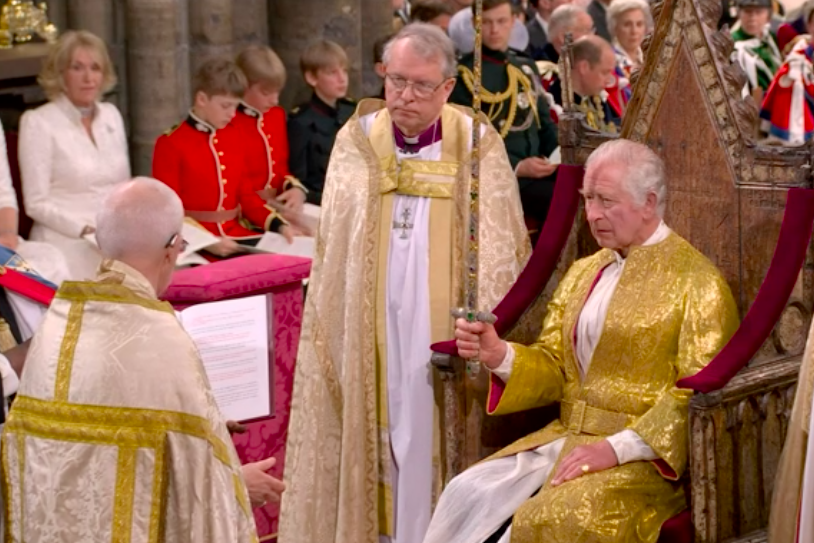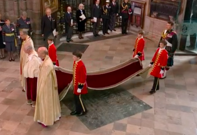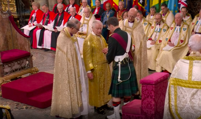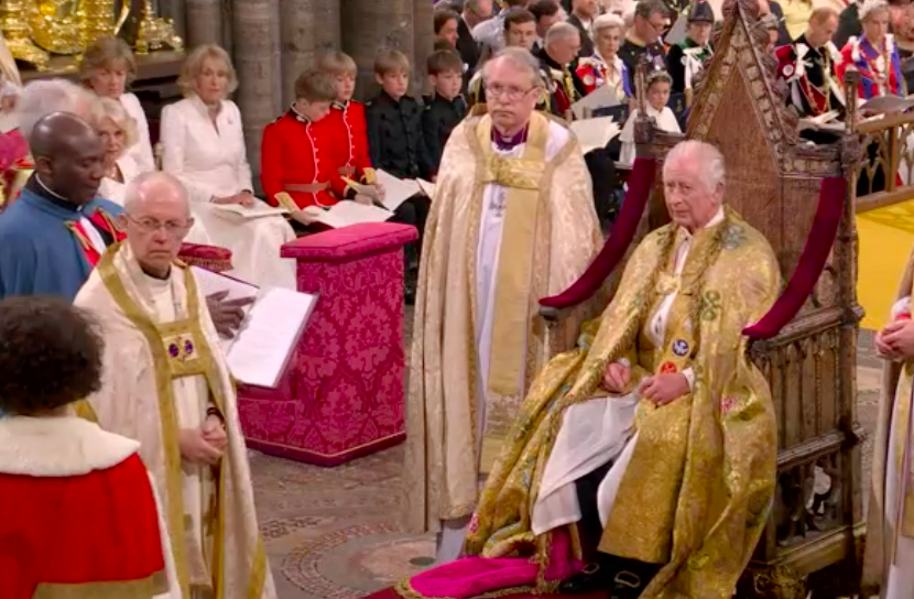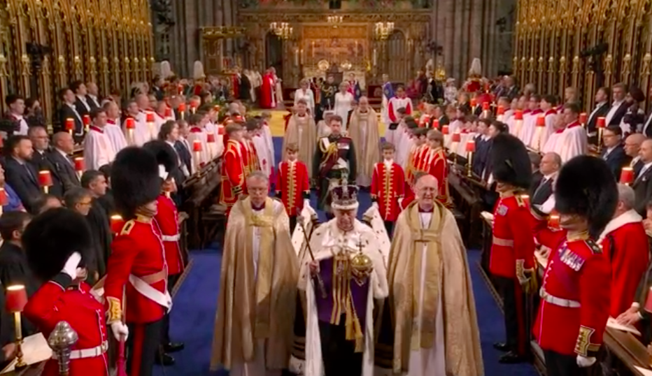 新国王が、赤い上着と白いブラウスも脱いで、何か誓ってから、今度は白いブラウスとゴールドのガウンを着せられて、イスラムっぽい歌に載せて、また何かの儀式。え?これが英国教会?と一瞬狐につままれてしまいました。エリザベス女王のとき、この場面はあったのかしら。あれこれと、誓います。I will.と宣誓しないといけないのは、圧迫感ありますね。