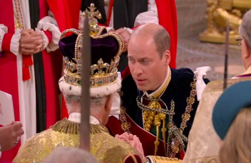 アンチョコを見ながら、台詞を唱えるウィリアム皇太子。ウィリアム皇太子がチャールズ国王の右頬に祝福のキスをした時だけ、国王は微笑まれましたね。