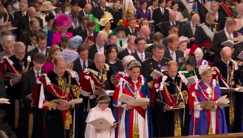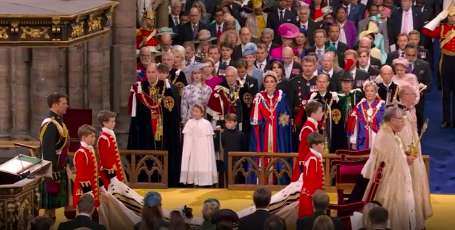 この写真の中央がアン王女です。アン王女の方が、チャールズ国王のお姉さんのような貫禄。「アンが男の子だったら!!!」と父エディンバラ公に言われたんでしたね。儀式でもだいぶ緊張されていたようでした。「アタシがついてるわよっ!」とアン王女がサポートされていそうです。