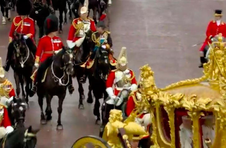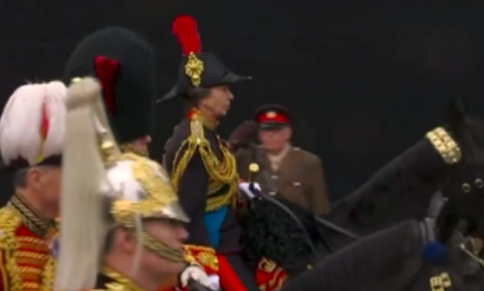 帰りのパレードは皇太子一家、エディンバラ公一家などご一家が列を成しています。アン王女はなんと!国王の馬車のすぐ後ろを馬に騎乗してパレードされています。大佐の格式で国王の護衛中。