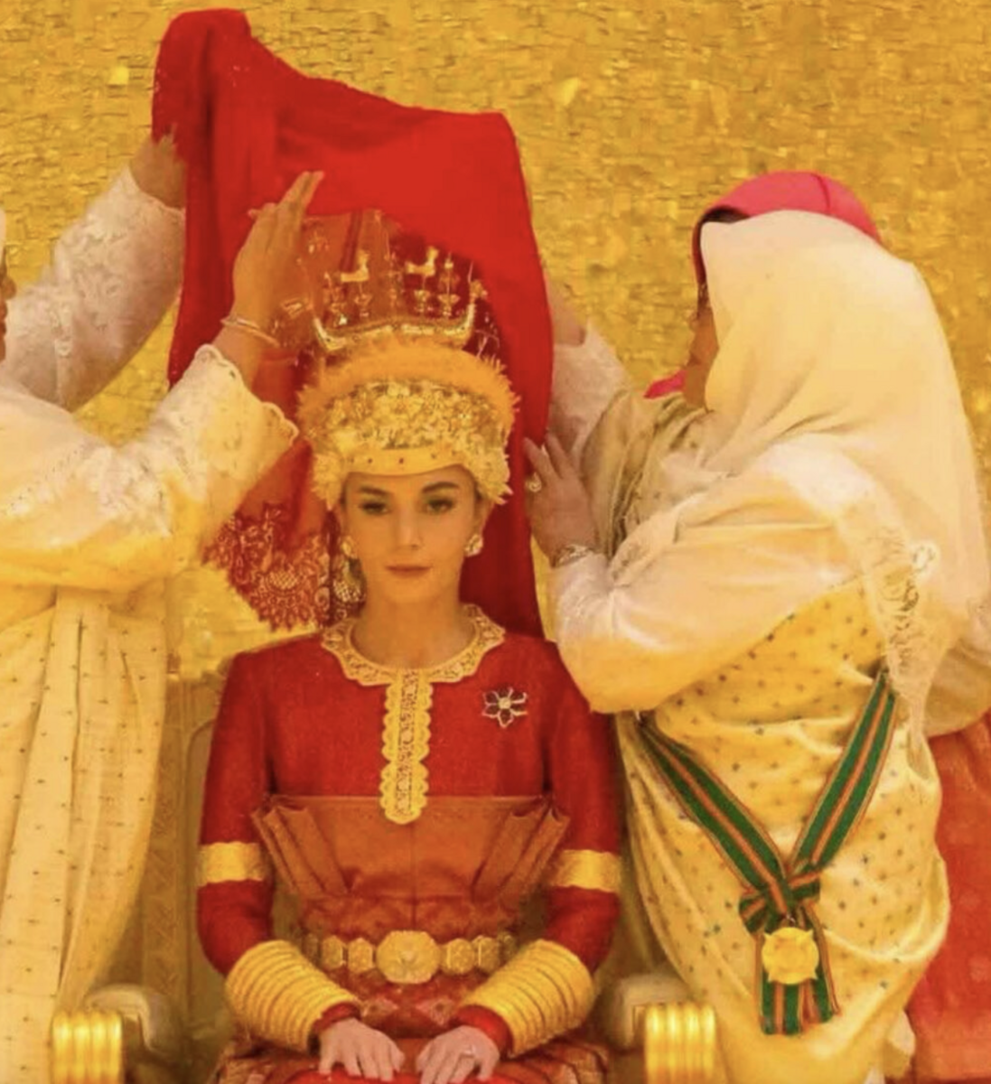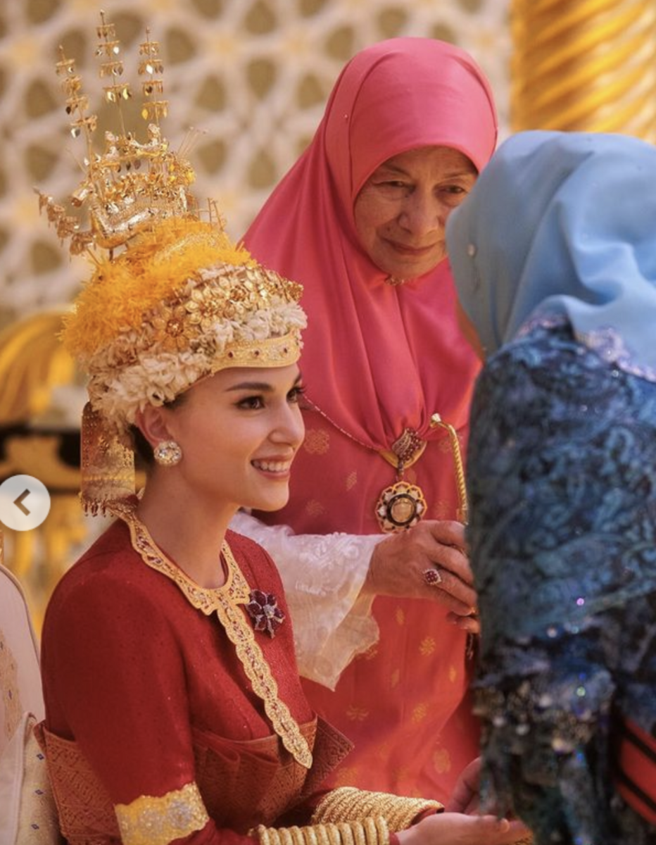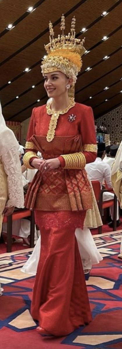 1月11日のこの儀式は、Powdering ceremony。この船が載っているような冠、すごいですね。なんとなくタイの民族衣装にも似ているような。花嫁入場は、赤いベールを被ってなのですね。モロッコ王族の結婚式でも、花嫁は緑のベールなどで顔を隠して登場でした。過去の王族結婚写真には、この時男性の方も、この赤い衣装にとてもよく似た衣装を着ている場合があって、はて、どう区別されているのでしょう。ブルネイ王族挙式写真集の記事に、過去の結婚写真を載せました。